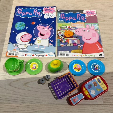 Peppa Gris lekesett og barnebøker. Pakken inneholder flere små figurer fra Peppa Gris-universet med tilhørende lekeelementer, som blant annet karusell og andre små plastdeler til rollelek. I tillegg følger det med flere barnebøker med stive permer med Peppa Gris-tema, med ulike historier om Peppa og familien. Settet egner seg til lek og høytlesning for barn som liker Peppa Gris.