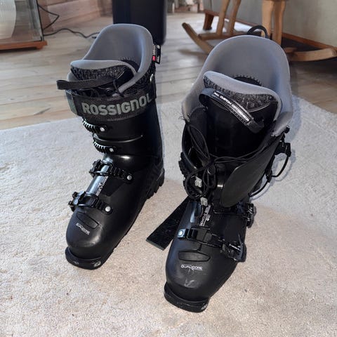 Nordica Sportmachine skistøvler i størrelse 29/29.5 (sålelengde 335 mm). Modellen har fire justerbare metallspenner og powerstrap øverst for bedre tilpasning rundt leggen. Skallet er i hardplast med grå og svarte detaljer, og innerskoen er polstret for komfort og støtte. Passer til bruk i alpinanlegg med vanlige alpinbindinger.
