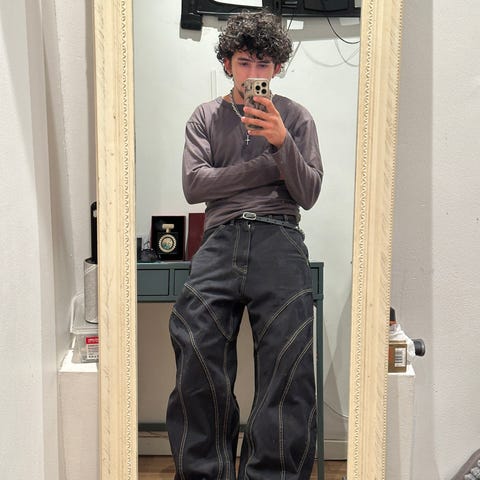 The Burley, our maxi fit jeans. With a super high rise, the Burley is slim at the waistband, curving out to give ample room at the hip, flowing down to a wide leg opening of 29 cm in a size 31. Constructed with a sewn-in pleat running down each leg.