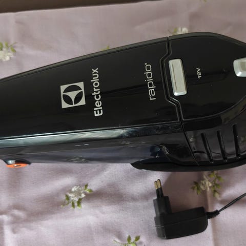 Electrolux Rapido håndstøvsuger med 14,4V oppladbart batteri. Modellen har integrert ladestasjon for veggmontering, som vist på bildene. Fargen er hovedsakelig svart med oransje detaljer. Håndstøvsugeren er egnet for mindre rengjøringsoppgaver som smuler, støv og annet småsøl på gulv, møbler og andre overflater i hjemmet. Strømforsyning og tekniske data fremgår av typeskiltet på undersiden av enheten (DC 14,4V).