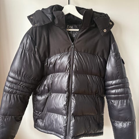 Air Jordan jakke for herre i størrelse S , passer også som M. Jakken er svart og laget i polyester, med vattering for ekstra isolasjon. Modellen har hette, glidelåslukking foran og flere lommer. Hetten kan tas av, og en lomme innsiden. Ytterstoff, fôr og vattering er i 100 % polyester, ifølge vaskelappen. Egnet som ytterjakke i kjøligere vær.