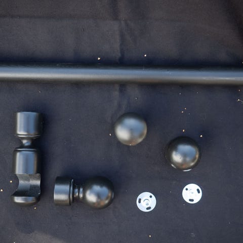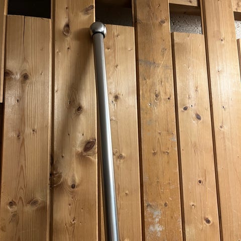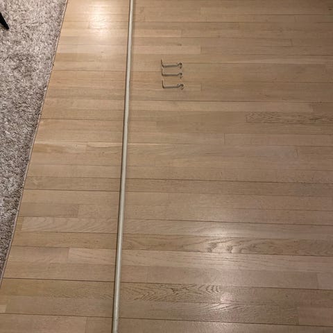 Hvit, regulerbar gardinstang med hvite endekuler, selges uten veggfester. Neste ikke brukt.