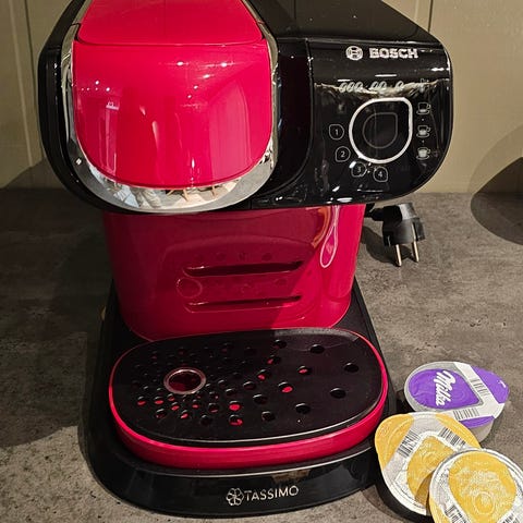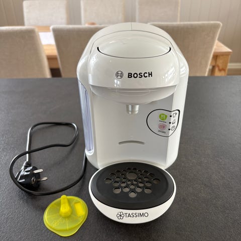 Bosch Tassimo kapselmaskin i hvit utførelse. Maskinen bruker Tassimo-kapsler til tilberedning av varme drikker som kaffe, te og kakao. Vanntank på baksiden med måleskala. Strømtilkobling 220–240 V, 50/60 Hz, effekt 1300 W. Egnet for bruk på kjøkkenbenk eller lignende flate arbeidsområder. Enkel betjening med frontåpning for kopp og avtagbart dryppbrett for lettere rengjøring.