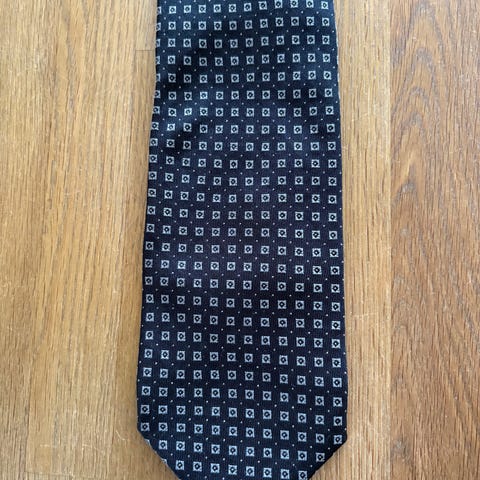 Slips i 100% silke fra Gordon Crane. Svart grunnfarge med hvitt mønster. 9,5 cm på det bredeste. Pent brukt. Kan hentes i Oslo eller sendes. Kjøper betaler porto.