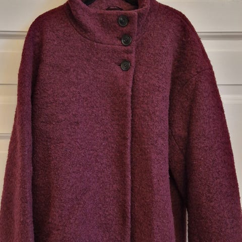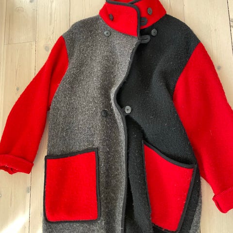 Ulljakke fra Lillann i 100% ull. Produsert i Norge og Norsk design. Lillann er forankret i Norsk tradisjon med bruk av lokal ull og tradisjonelt håndverk. Fargen på kåpen er bringebærrød med svarte detaljer og linjer. Jakken er lik en str L, men kan brukes oversized. Jeg er str S.