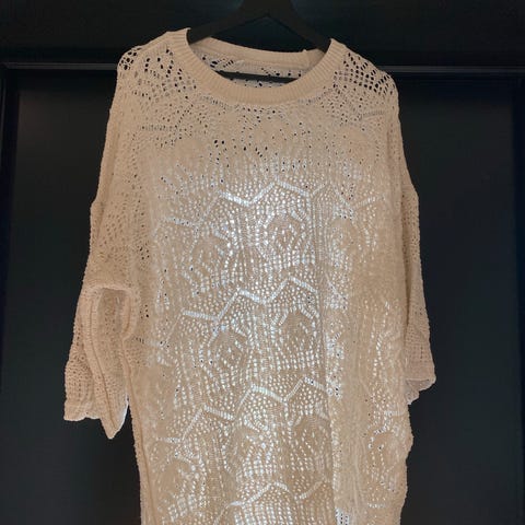 Selv kjøpt brukt. Men har ikke blitt brukt. Måler 54 fra u.arm til u.arm. Garntype er ukjent, men virker for meg som bomull