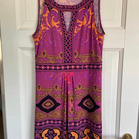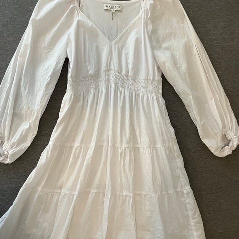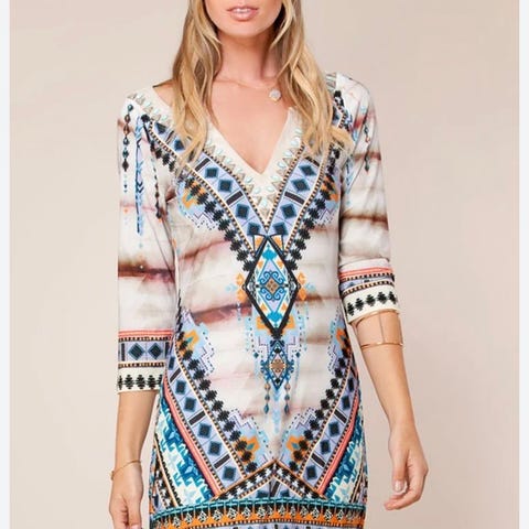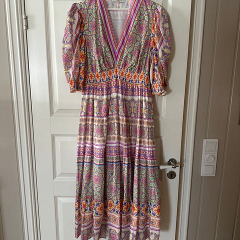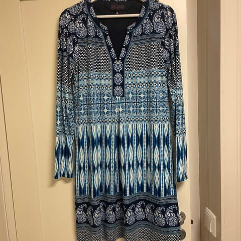 Hale Bob sommerkjole for dame i størrelse M. Kjolen er i blåtoner med mønstret trykk og har lange ermer. Materiale i polyester. V-utringning med dekorative detaljer foran. Egnet som sommerkjole eller til fritidsbruk.Den har brodert perler i front.