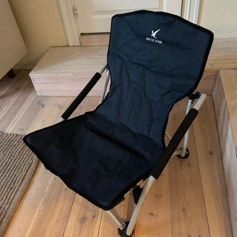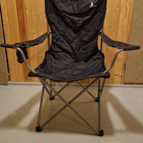 sammenleggbare campingstoler i grått stoff den store med polstret sete og rygg. Stolen har armlener, integrert koppholder Leveres med transportpose for enkel frakt og lagring. Egnet som turstol til camping, hagebruk, festival eller andre utendørsaktiviteter.