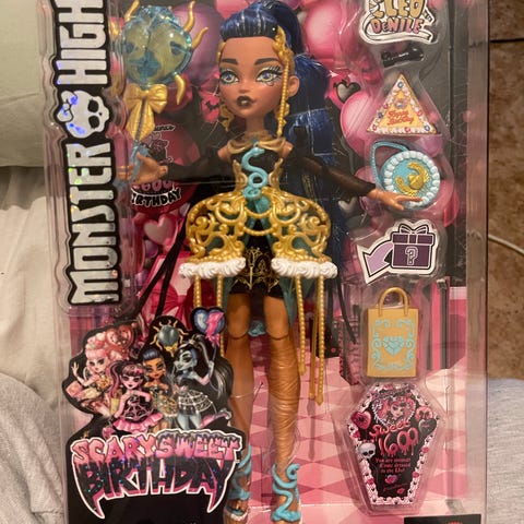 Monster High Clawdeen Wolf Monster Fest dukke i original eske. Dukken har langt lilla hår og er kledd i et antrekk i lilla, rosa og gylne farger. Settet inkluderer flere små tilbehør, blant annet veske og dekorative detaljer som kan brukes sammen med dukken. Egnet som leke for barn som liker Monster High-universet eller som samleobjekt for samlere av Monster High-dukker.