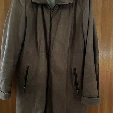 Lommer, liten splitt i sidene, reim rundt hals. Varm.
