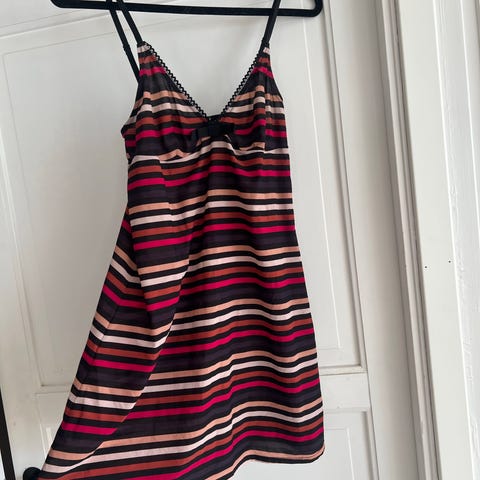 H&M Sonia Rykiel kjole i størrelse L. Kjolen er flerfarget med horisontale striper i ulike nyanser og har tynne, justerbare stropper. V-utringning med blondekant og sløyfedetalj foran. Laget i polyester. Stoffet er elastisk. Egnet som lett sommerkjole eller som nattkjole/underkjole, avhengig av ønsket bruk.