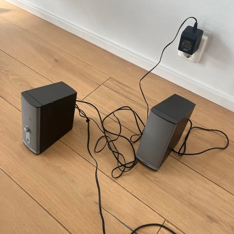 Acoustimass, 2 speakers, control pod, audio input cable og power cord følger med.