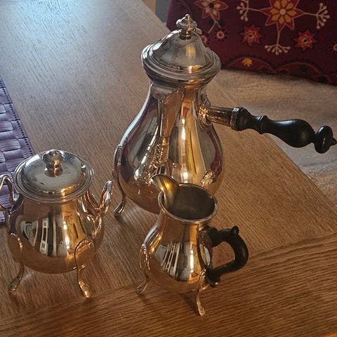 Staselig sett med kaffekanne, fløte og sukkerskål