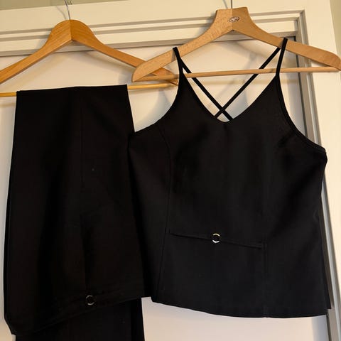Dressbukse og ermeløs topp med fine detaljer selges. Dressen er fra tidlig 2000 tall og er lite brukt. Hel og pen. Bukse er størrelse 34 og topp størrelse 36.
