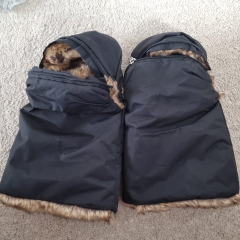 Carena vognhansker i rosa og svart. Hanskene festes med trykknapper rundt håndtaket på barnevogn eller sportsvogn, slik at de sitter fast under trilletur. Yttermaterialet er glatt og vannavvisende tekstil, med mykere stoff på innsiden for økt komfort og varme. Leveres som et par og er beregnet for voksne som triller vogn.