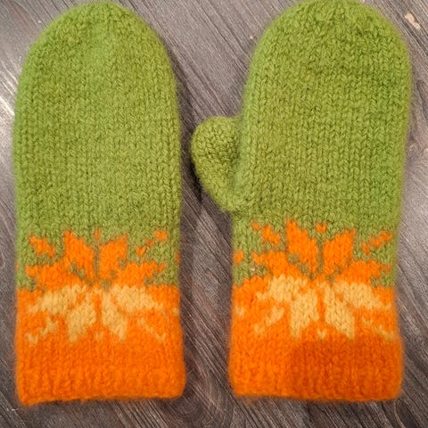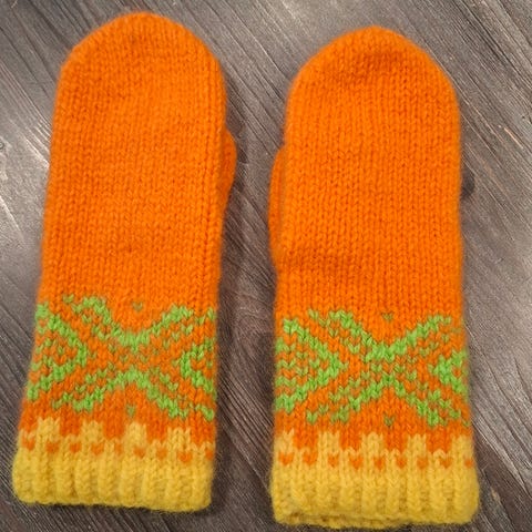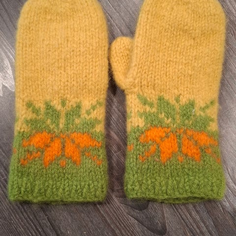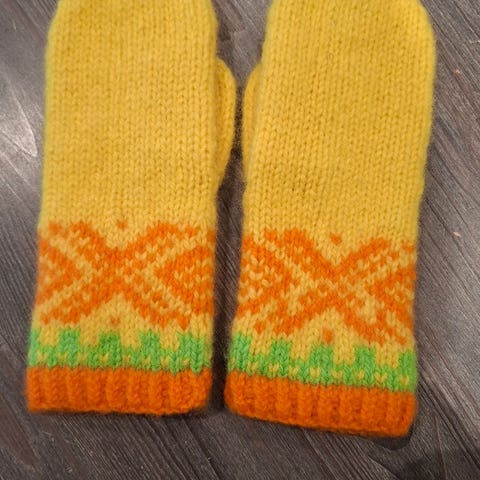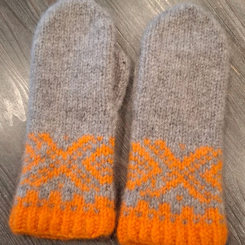 Håndstrikka og tova damevotter.