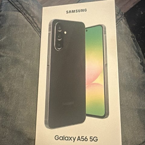 Helt ny, uåpnet. Samsung Galaxy A56 5G smarttelefon med 128 GB lagringsplass. Modellen tilhører Galaxy A-serien og har et moderne helskjermdesign med frontkamera i skjermen. Baksiden har trippelkamera med LED-blits plassert i venstre hjørne. Telefonen vises i en lys rosa farge med blank finish.