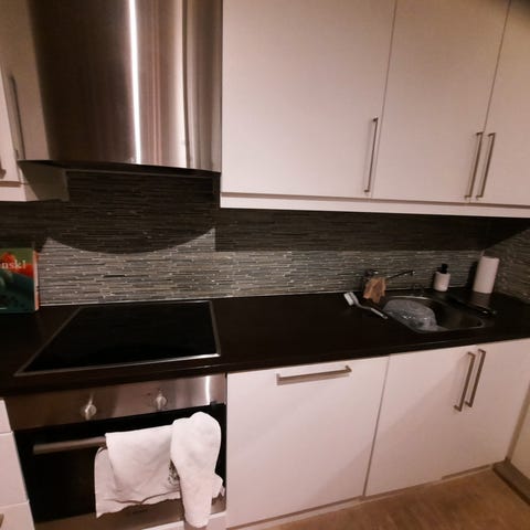 Miele integrert stekeovn og mikrobølgeovn i rustfritt stål. Stekeovnen er innbygget i høyskap sammen med skuffer under, og har front i rustfritt stål med sort glassfelt. Mikrobølgeovnen er også integrert i høyskap med tilsvarende utførelse i rustfritt stål og sort glass. Kjøkkenet har ellers hvite fronter, sort benkeplate og integrert ventilator over koketopp. Sort side-by-side- kjøl og frys i sort er med. hvitevarer og skap i standard høyde. Benkeplaten er i sort granitt. Det er også to varmeskuffer med. Lengde på kjøkken er 340 på begge sider. Høyde på benken over stekovn/mikro er 140cm. Pris kan diskuteres!