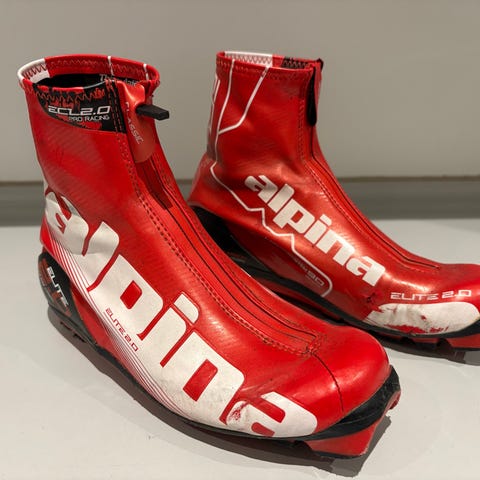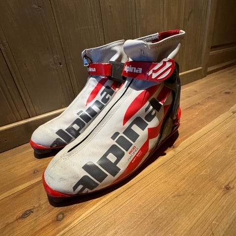 Alpina klassisk langrennsstøvler str 42 i rød farge. Vi har sluttet med klassisk og skoene blir ikke brukt.. gode sko. Passer til mosjonister og mer aktive utøvere..