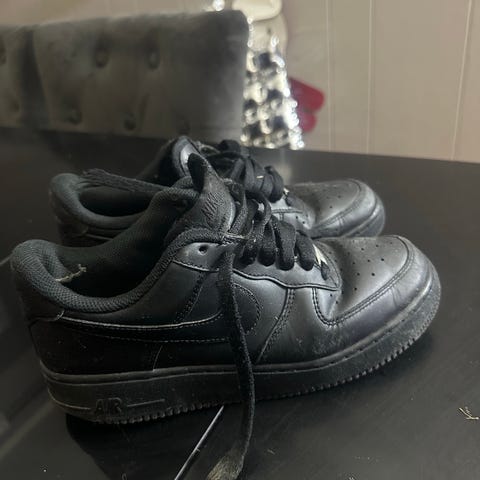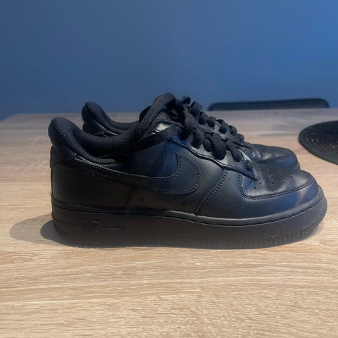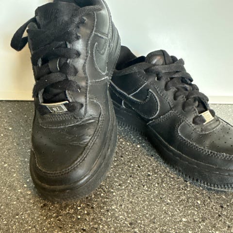 Nike Air Force 1 joggesko i størrelse 36 for unisex. Skoene er helsvarte med snøring og klassisk Nike-logo på siden og hælen. Overdelen er i skinn med perforeringer i tåpartiet for ventilasjon. Yttersålen er i gummi med mønster som gir godt grep. Passer til hverdagsbruk og fritidsaktiviteter for barn og unge som bruker størrelse 36.5.