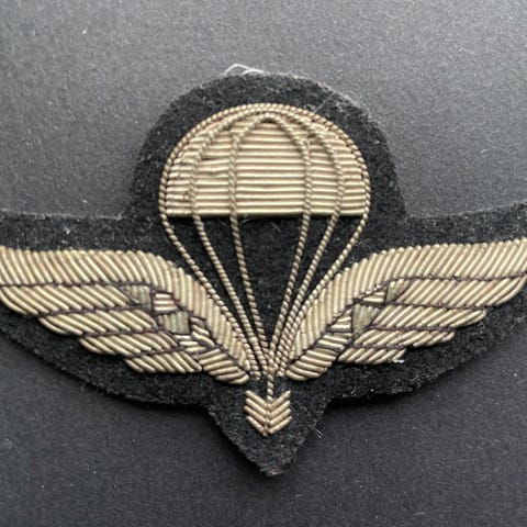 FSK. MJK. HJK. KJK. HFJS. FS. Hærens Fallskjermjegerskole. Forsvarets Spesialkommando. Kystjegerkommandoen. Hærens Jegerkommando. Marinejegerkommandoen. Hoppevinge. Forsvarets spesialstyrker. Spesialjeger. Spesialsoldat. Fallskjermjeger. Sjøforsvaret. Marinejeger. Hæren. Hærens Krigskole. Marinen. Politiet. Marinejeger. Delta. Politiets innsatsstyrke. Beredskapstroppen. Militært merke. Hederstegn. Tøymerke. Utenlandstjeneste. Fallskjermvinge. Kvalifikasjonsmerke. Meget fin stand, siden den har tilhørt en militær samling.