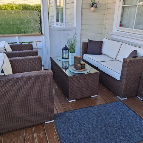 Hage-/loungesett i brun kunstrotting med puter. Settet består av to stoler, en toseters sofa og et rektangulært bord med glassplate på toppen. Stolene og sofaen har seteputer i lys farge.