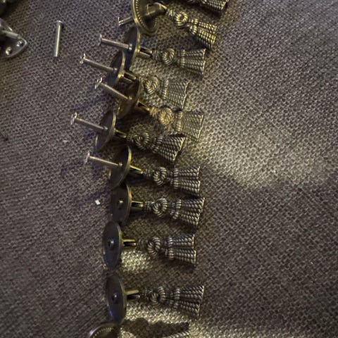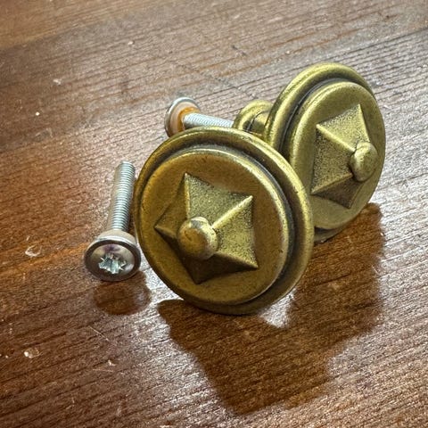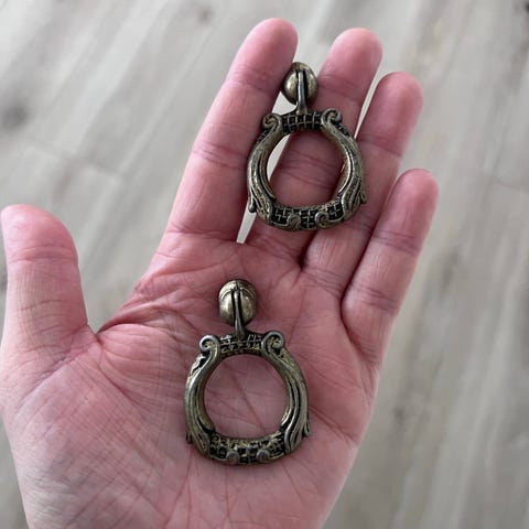 Helt nye vintage skuffehåndtak i antikk messing, ofte brukt på kommoder eller kjøkkenskap.