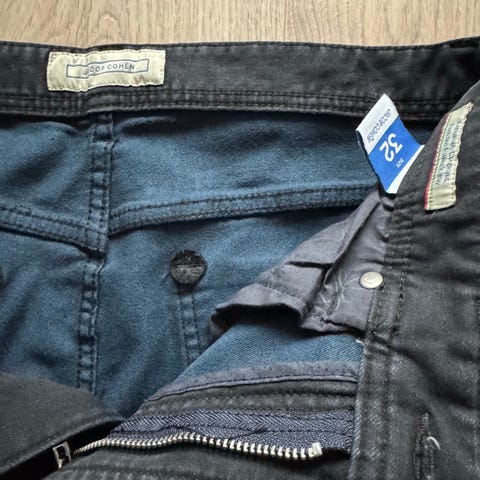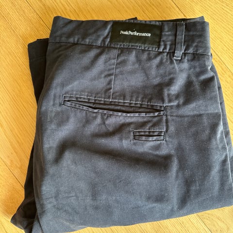 J. Lindeberg pre washed chinos for herre i størrelse M. Buksen er i blå farge og laget av bomull. Klassisk chinosmodell med beltehemper, knapp og glidelåslukking foran. Skrålommer i sidene og to baklommer med knapp. Størrelse 31 og lengde 32