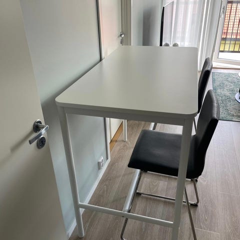 Til bordet følger det med matchende hvite stoler med rette metallben. Stolene har formstøpt sete og rygg i ett stykke, med glatt overflate som er enkel å tørke av.
