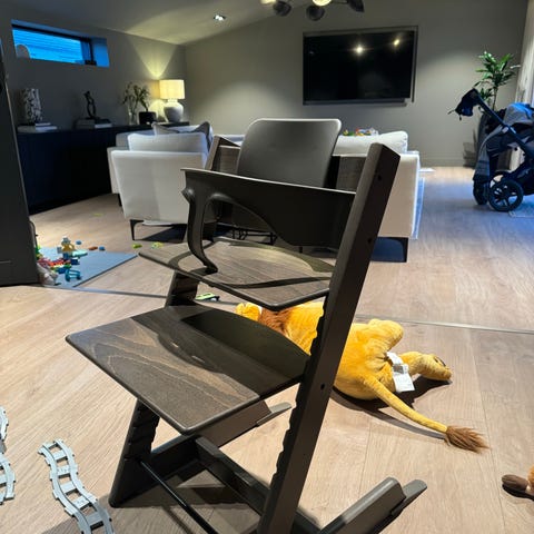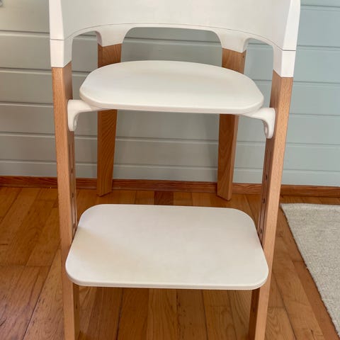 Stokke høy barnestol i hvit farge. Stolen har fotbrett og sitteplate som kan justeres i høyden. Leveres med bøyle foran for ekstra støtte til barnet. Ubrukte seler følger med.