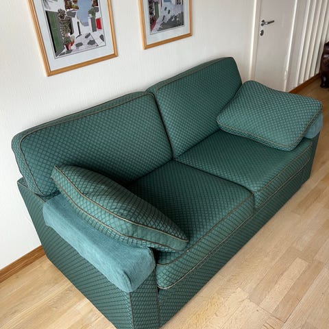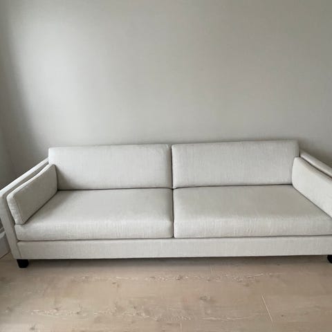 3-seter sofa i beige tekstil. Sofaen har rette armlener, to seteputer og to ryggputer. Treben gir sofaen noe høyde fra gulvet. Nøytral farge og enkel utforming som passer i stue eller TV-rom. Stofftrekket har strukturert vev i lys beige tone. Sittehøyde 42 cm. Merke Slettvoll.