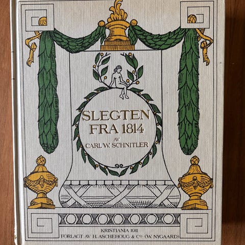 «Slegten fra 1814» av Carl W. Schnitler. Utgitt i De norske Bokklubbene. Innbundet utgave med smussomslag, 512 sider. Boken inneholder også et innledende essay av Gunnar Danbolt. Egner seg for lesere med interesse for norsk kultur- og slektshistorie samt litteratur fra 1800-tallet og framover.