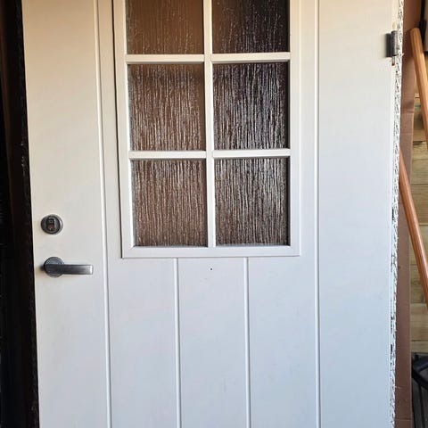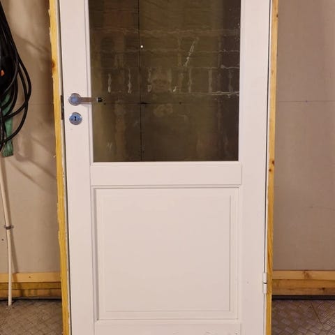 Innerdør med flere vertikale glassfelt og hvitmalt ramme. Døren har rektangulære glassruter som slipper inn lys mellom rom. Passer til innvendig bruk i bolig, hytte eller lignende der man ønsker en dør med glassfelt for bedre lysgjennomgang.