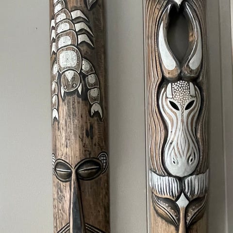 Selger to dekorative veggmasker i tre. De er håndskårne med fine detaljer og gir et varmt, eksotisk uttrykk i rommet. Perfekt som statement-piece på veggen.