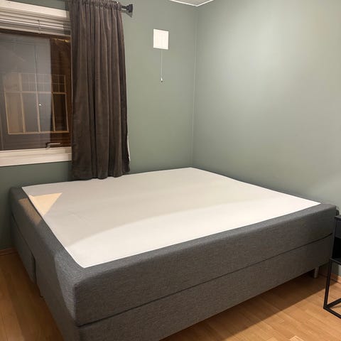 Jysk seng kontinental 180x200 i grått tekstiltrekk. Står på ben i metall. Overmadras i lys farge, som vist på bildene. Egnet som dobbeltseng i soverom eller gjesterom. Ble kjøpt i august 2025, veldig lite brukt, som ny. Deilig å sove i, selges grunnet flytting. Du kan få den veldig billig hvis du kan hente i dag. Denne samme sengen er til salgs hos Jysk nå for fullpris, tror det er rundt 8000 den koster ny nå