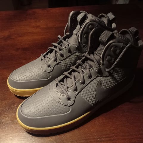 Nike Air Force 1 (duckboot) sneakers i størrelse 43. Modellen er en høy variant med snøring foran. Skoene er i en beige farge med sorte lisser og sort yttersåle. Overdelen består av kombinasjon av tekstil og syntetisk materiale/skinnpreg, med polstret hælkappe og tunge for økt komfort. Yttersålen har sirkelmønster som gir godt grep. Egnet som hverdagssko og fritidssko.