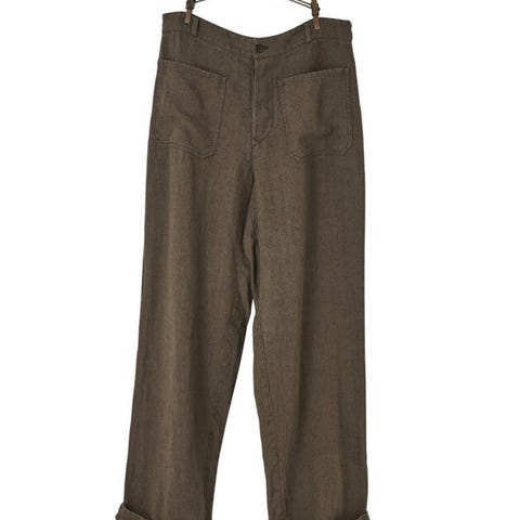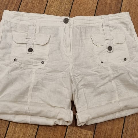 Høy midje med bred linning og dekorative knapper foran. Lett løs passform med oppbrettede ben gir en avslappet, elegant silhuett og god komfort på varme dager.
