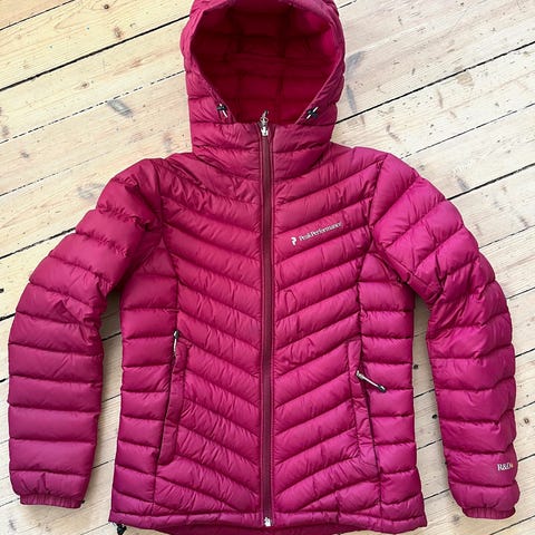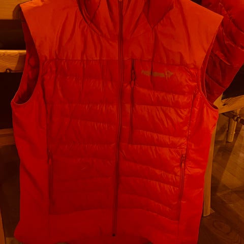 Norrøna Falketind down750 dunvest for dame i størrelse M. Vest i rødfarge (True Red) med hette og gjennomgående glidelås i front. Lett, isolerende dunfyll (down750) med vatterte kanaler for jevn fordeling av dun. To sidelommer med glidelås og høy krage for ekstra beskyttelse. Egner seg som ytterplagg i mildere vær eller som mellomlag under skalljakke ved friluftsaktiviteter og hverdagsbruk.