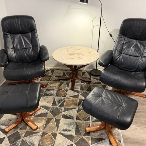 Selger mine to recliners, som er uslitelige. Norske kvalitetsmøbler på sitt beste. Utrolig komfort og kvalitet. Høystbydende over 1000, selges helst samlet. Gi bud innen søndag 22. feb kl 12.