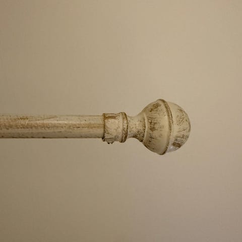 2 dekorative, litt tykkere gardinstenger i metall, hvite med gullskimmer, og 4 dekorative kule-endestykker.