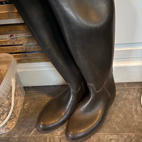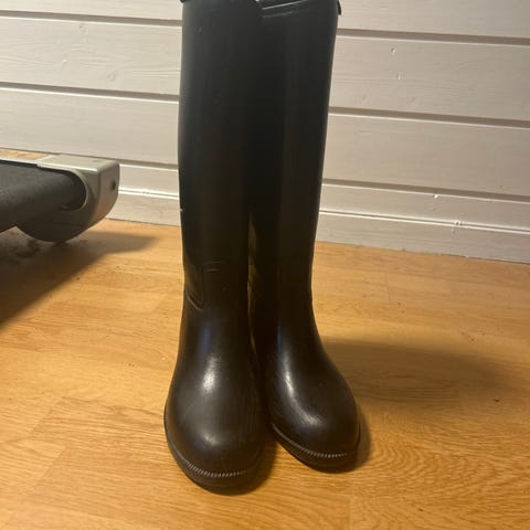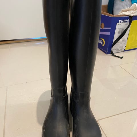Høye ridestøvler i svart farge i størrelse 39. Støvlene har glatt overdel og mønstret såle for bedre grep. Egnet til bruk i vått vær også