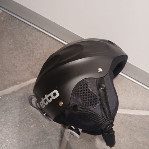 Etto alpinhjelm i størrelse S, oppgitt til 55 cm omkrets. Hjelmen har ytre skall i svart med rød og hvit detaljering og rød polstring på innsiden. Justerbar hakestropp for sikker passform. Egnet for alpint og lignende vintersport der det kreves hodebeskyttelse.
