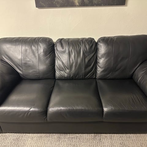 Sofagruppe bestående av 2 stk 2-seter sofa lyse grått skinn. Sittehøyde 44 cm . Pene og lite brukt . 2-seterne selges samlet for kr. 6000,-