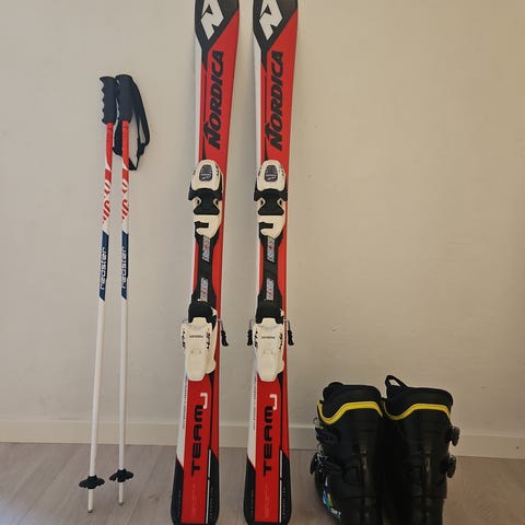 Selger komplett slalompakke med ski, staver, sko og hjelm.