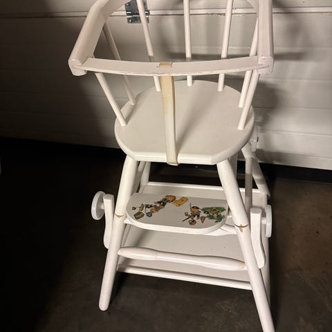 IKEA høy barnestol i tre. Stolen har ryggstøtte og fotstøtte som gir barnet en stabil og oppreist sitteposisjon ved bordet. Passer til bruk på kjøkken eller spiseplass for barn som trenger en høyere sittehøyde. Nøytral trefarge som passer inn i mange typer interiør.