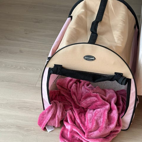 Sammenleggbart hundebur i stoff. Buret er laget i tekstil med nettingfelt for lufting og innsyn. Størrelse ca. 43 x 43 x 61 cm. Fargekombinasjon blå og grå. Buret har bærehåndtak, åpning i front og på topp, samt lommer på siden for oppbevaring av småting. Inne i buret ligger en enkel pute/bunnmatte. Egnet som midlertidig hvileplass eller transportbur for mindre hunder eller andre små kjæledyr, for eksempel i bil eller innendørs.