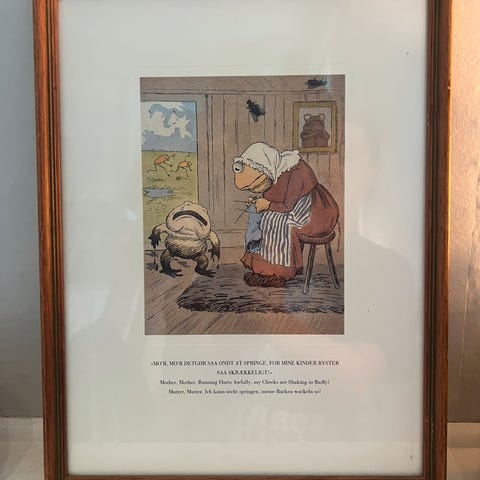 Innrammet kunsttrykk med motiv av trollet som vasker ungen sin. Bildet er i svart-hvitt og er montert med passepartout. Rammen er i lyst treverk og har enkel, rett kant. Kunsttrykket passer til oppheng på vegg i stue, hytte eller andre oppholdsrom der man ønsker et motiv inspirert av norsk eventyrtradisjon.