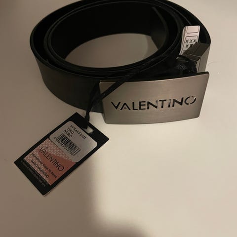 Svart skinn med glatt overflate og sort metallspenne med Mario Valentino-logo.