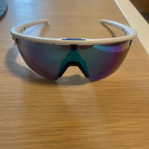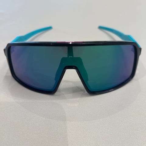 Oakley solbriller for unisex med sportslig innfatning i blå farge. Modellen har store, sammenhengende speilglass i blå/lilla tone som gir godt synsfelt. Rammen er slank med rette stenger og fargedetaljer på sidene. Passer til bruk ved utendørsaktiviteter og hverdag.