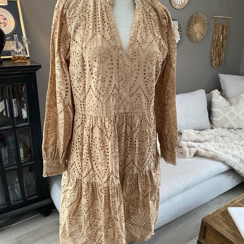 YAS hverdagskjole for dame i størrelse M. Kjolen er svart og laget i bomull. Den har lange ermer, v-utringning og broderie anglaise-inspirert hullmønster i stoffet. Skjørtet er lett utsvingt med volanger som gir en løs og komfortabel passform. Egnet som hverdagskjole og kan brukes både til jobb og fritid.